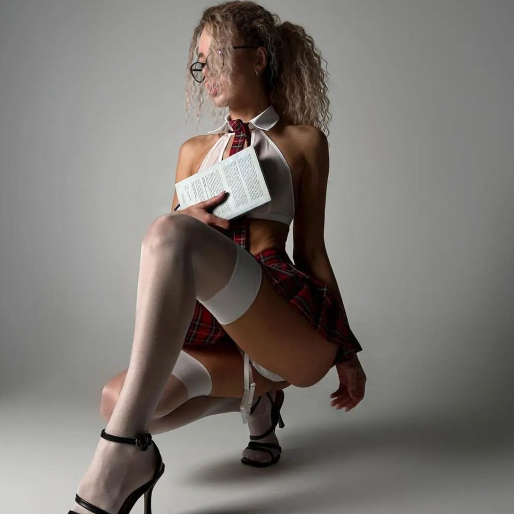 • Set Includes: Bra, Thong , Socks, Skirt, & Tie